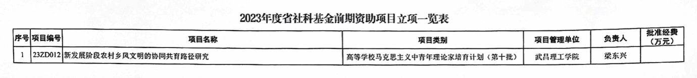 近日,湖北省教育厅、湖北省哲学社会科学工作领导小组办公室发布《关于2023年度省社科基金前期资助项目立项的通知(鄂教思政函〔2023〕14号)》,我校Beat365中文官方网站教授、城乡融合治理研究中心主任梁东兴申报的《新发展阶段农村乡风文明的协同共育路径研究》成功立项(项目编号:2023ZD012),实现我校在该领域的突破。依据前期申报通知,“湖北省高等学校马克思主义中青年理论家培育计划(第十批)”,计划以湖北省高等学校哲学社会科学研究重大项目资助50人左右,本次全省高校实际仅有32人入选该计划,其中民办高校仅2人入选。