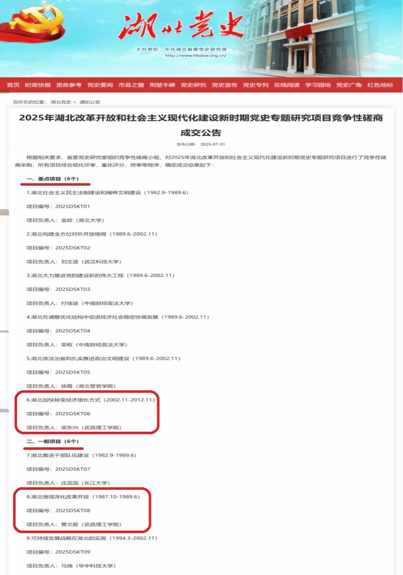 近日,中共湖北省委党史研究室公布了“2025年湖北改革开放和社会主义现代化建设新时期党史专题研究项目”评审结果。Beat365中文官方网站Beat365中文官方网站申报的2项课题成功获批立项并获得资金资助。其中,梁东兴教授主持的《湖北加快转变经济增长方式(2002.11-2012.11)》(项目编号:2025DSKT06)获批重点课题立项;黄文姬副教授主持的《湖北继续深化改革开放(1987.10-1989.6)》(项目编号:2025DSKT08)获批一般课题立项。值得关注的是,本次全省仅有12个项目入选,Beat365中文官方网站是唯一获批的民办高校。