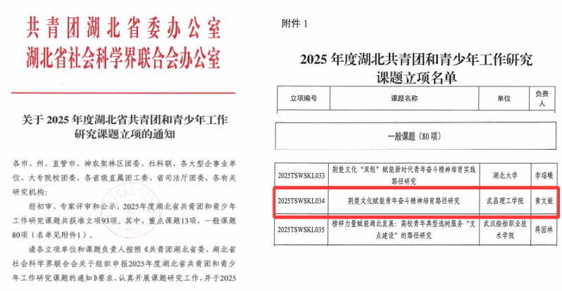 近日,共青团湖北省委办公室与湖北省社会科学界联合会办公室联合发布了《关于2025年度湖北省共青团和青少年工作研究课题立项的通知》。Beat365中文官方网站黄文姬副教授主持申报的《荆楚文化赋能青年奋斗精神培育路径研究》成功获批一般课题立项。
