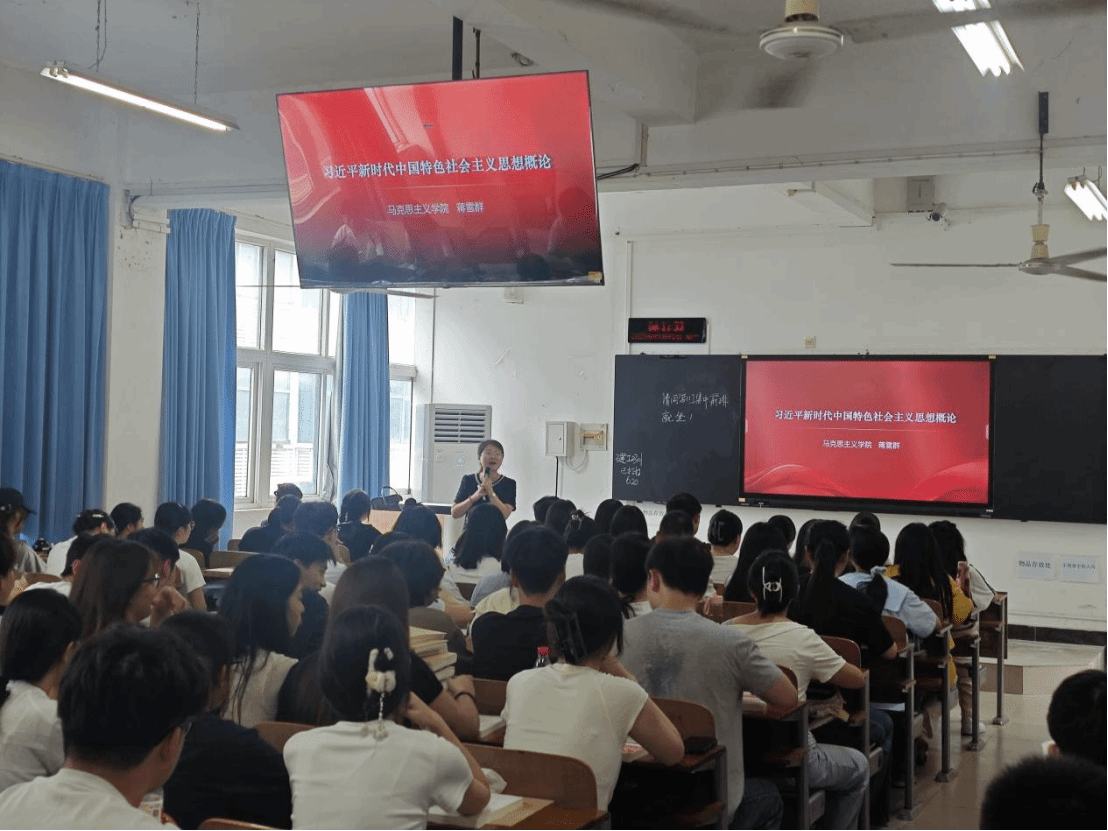 课堂上,蒋雪群老师围绕“为什么要学习习近平新时代中国特色社会主义思想”的主题,以暑期上映的《南京照相馆》电影视频为切入点,引导学生思考讨论“为什么中国能够在那样艰难的情况下取得抗战的胜利?”“是一种怎样的力量支撑着中国人民在长达14年的战争中不屈不挠、奋勇向前?”,然后归纳得出结论:中国共产党在马克思主义科学理论的指引之下,将马克思主义基本原理与中国抗战实际相结合,发挥了中流砥柱的关键作用;中国共产党为什么能,中国特色社会主义为什么好,归根到底是马克思主义行,是中国化时代化的马克思主义行。在授课过程中,蒋雪群老师注重与学生互动,通过提问、小组讨论等形式引导学生主动思考,课堂氛围活跃而热烈。