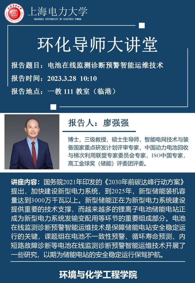 主讲人简介:廖强强,博士,三级教授,硕士生导师,智能电网技术与装备国家重点研发计划评审专家,中国动力电池回收与梯次利用联盟专家委员会专家,ISO中国专家,高工金球奖(储能)评委团评委。主要开展电池性能评估、电动汽车动力电池梯次利用、电池储能系统在电网中的应用、储能电站评估、综合能源系统评价。获得上海市科技进步奖2项,中国电力企业联合会电力科技创新奖二等奖1项、中国安装协会科学技术进步奖1项,制定国际标准、国家标准、地方标准各1项,团体标准2项,出版编著2本,SCI、EI收录论文50多篇,申请发明专利17项,授权10项,转让6项,获得3项软件著作权证书;被上海市教卫党委录用和报送中共中央办公厅的智库专报1份。